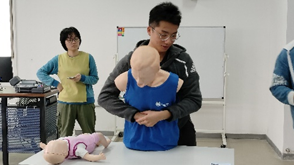 学员们积极参与,认真听讲,展现了对急救知识的浓厚兴趣和热情。在止血包扎环节,老师向大家介绍了针对不同情况的止血方法;在海姆立克急救法的教学中,老师详细演示讲解了成人和婴儿两种情况下的操作步骤和注意事项;最后,老师逐步讲解了心肺复苏的完整流程和AED的使用方法。在每一个环节和操作步骤的教学中,老师都让学员们进行了充分的实操练习,确保大家都能熟练掌握。学员们也在这一过程中积极提问,针对实际情况进行讨论,在理论知识学习和实际操作中逐渐掌握了各种急救技能。