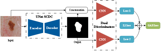 提出的基于双判别生成对抗网络的皮肤病分割模型流程图