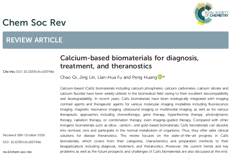 Careers近日,我院黄鹏特聘教授团队在英国皇家化学学会创办的化学类国际顶级期刊Chemical Society Reviews (影响因子38.618,中科院JCR 1区,TOP期刊)上发表了题为《Calcium-based biomaterials for diagnosis, treatment, and theranostics》的综述性学术论文(DOI: 10.1039/c6cs00746e)。深圳大学是唯一单位和唯一通信单位,该团队漆超博士是第一作者,黄鹏教授为通讯作者,该团队所在的生物医学工程学科属于广东省优势重点学科。