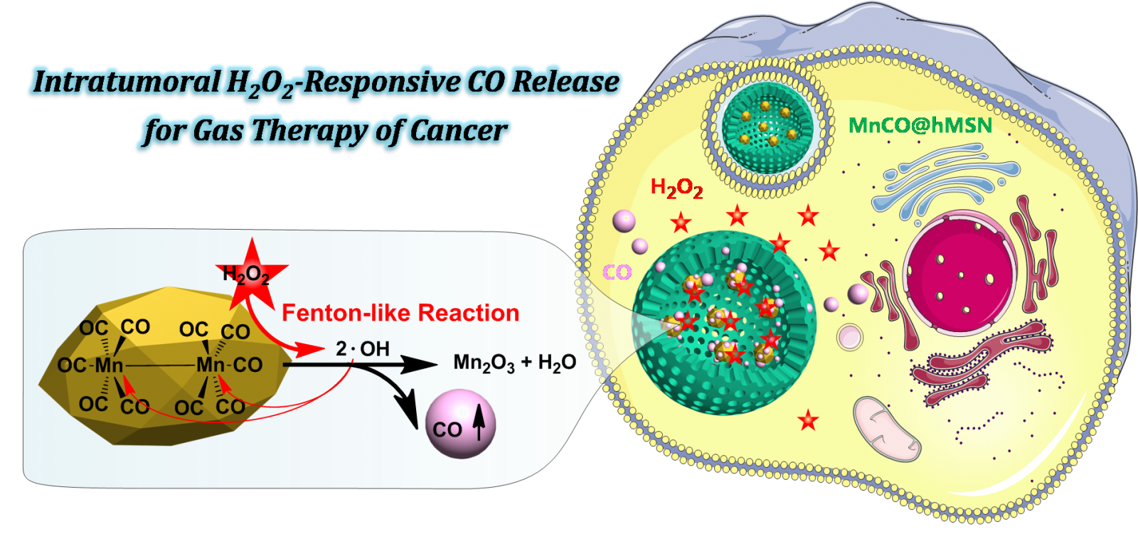 内刺激源可控药物释放具有不受组织穿透深度限制的优势,能够更有效的将药物递送至深层疾病组织,譬如肿瘤内部。针对肿瘤治疗而言,肿瘤微环境是一种理想的内源性刺激源,包括酸性、还原性和高表达的双氧水等。因而,如何借助肿瘤微环境中的内刺激源,来实现内刺激源响应性的气体释放呢?最近,何前军教授最近的一项研究工作为这个科学问题提供了一种解决方案!