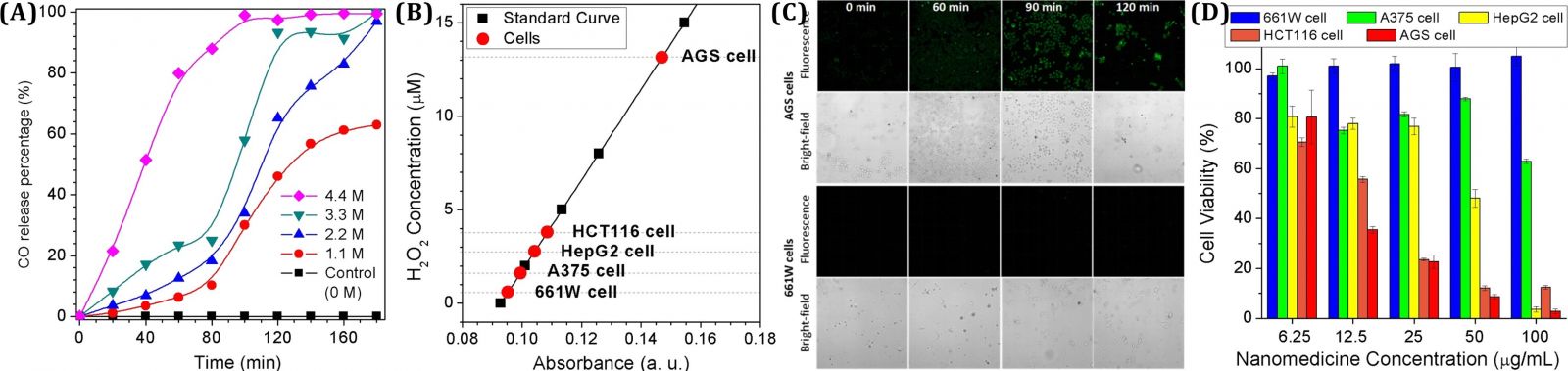 为了实现肿瘤微环境响应性气体释放,该课题组开发了一种新型的对肿瘤内双氧水响应的纳米气体药物MnCO@hMSN(如下图A)。双氧水在正常组织中低表达或者不表达,但在肿瘤中过度表达(如下图B)。这种双氧水表达的巨大差异性导致纳米药物选择性在肿瘤中分解释放CO气体,而在正常组织中不分解释放气体(如下图C),因而产生了一种选择性杀死癌细胞、而对正常细胞没有影响的抗癌特效(如下图D)。该课题组提出的内刺激源响应性控释治疗性气体的策略为选择性抗癌提供了新的思路,有利于极大地提高肿瘤治疗效果、降低药物毒副作用。