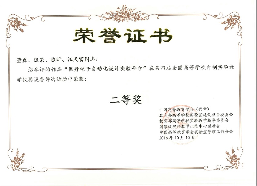 我校选送的“医疗电子自动化设计实验平台”(完成人:董磊、但果、陈昕、汪天富)荣获“第四届高等学校自制实验教学仪器设备评选及优秀作品展示活动二等奖”!特此祝贺!