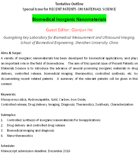 “Biomedical Inorganic Nanomaterials”特刊分列如下四个方面的专题,诚邀相关领域的专家踊跃投稿。联系人:何前军;邮箱:nanoflower@126.com