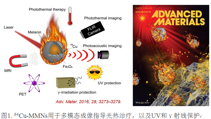 为攻克癌症这一世界性难题,该课题组开创性地利用人体内生物色素-黑色素作为原料,通过仿生法成功合成了磁性黑色素纳米颗粒(MMNs),再利用黑色素能吸附金属离子的特性,实现了快速一步放射性核素64Cu百分百标记。标记后的纳米探针可利用正电子发射计算机断层显像(PET)、核磁共振成像(MRI)和光声成像(PAI)三种成像模式同时指征肿瘤。再加上黑色素对近红外区光有很强的吸收,具有优越的光热转化效率,该探针在肿瘤部位蓄积后利用较低的激光照射便可达到高效的肿瘤光热治疗效果,从而实现了多模态成像指导的光热治疗。令人惊喜的是,MMNs还具有UV和γ射线保护功能(图1)。该纳米探针由黑色素和四氧化三铁组成最佳伴侣,而这两种物质均具有很好的生物相容性,因此MMNs具有极高的临床转化应用价值。