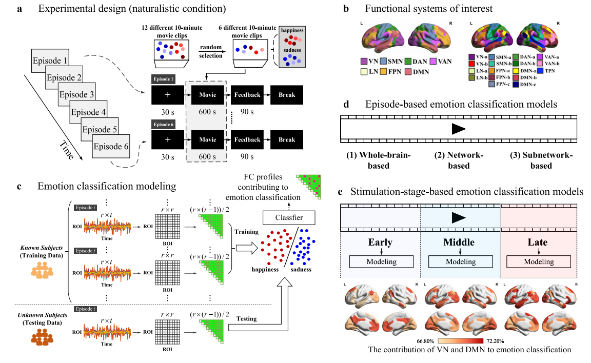 本研究聚焦于长时情绪状态下的全脑功能表现和在时间上的变化规律。研究结果显示,情绪的时间累积效应主要表现为以默认模式网络和视觉网络为核心的多个网络协同运作的分布式表征,为大脑情绪加工机制的理解提供了新的思路和见解。
