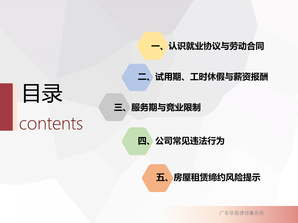 张嘉惠律师在本次就业普法讲座中,围绕以下五个方面为学生们介绍了相关法律知识: