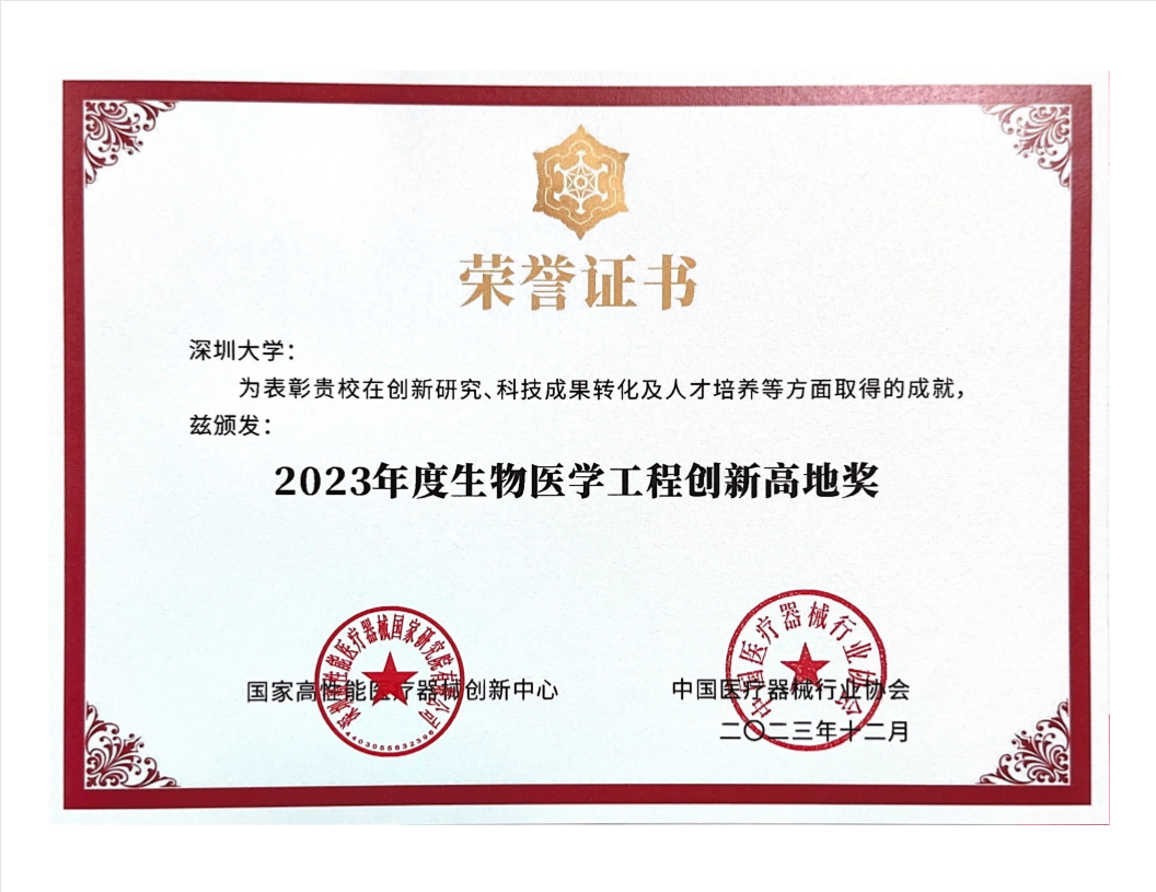 作为本次峰会的一大亮点,国家高性能医疗器械创新中心公布了“2023年度生物医学工程创新高地”榜单,以表彰在该领域取得突出成就的高校和科研机构。深圳大学凭借其在生物医学工程领域的卓越贡献和创新实力,成功跻身榜单,该奖项由深圳大学医学部生物医学工程学院组织申报。