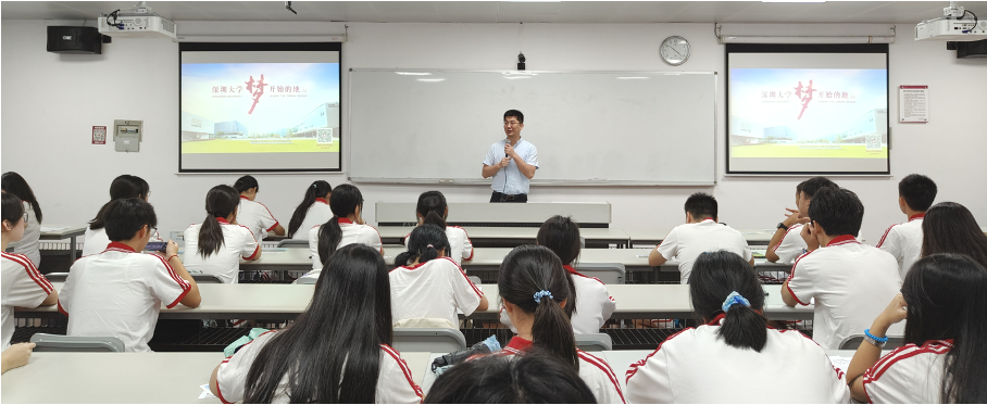 本次广州中学的参观交流由生物医学工程学院助理教授王蒙老师作为深圳大学领队。上午9:30,广州中学师生在汇德楼A509室听取了来自计算机与软件学院的副教授彭小刚老师和生物医学工程学院的助理教授张力老师对深圳大学和相关特色专业的精彩宣讲。