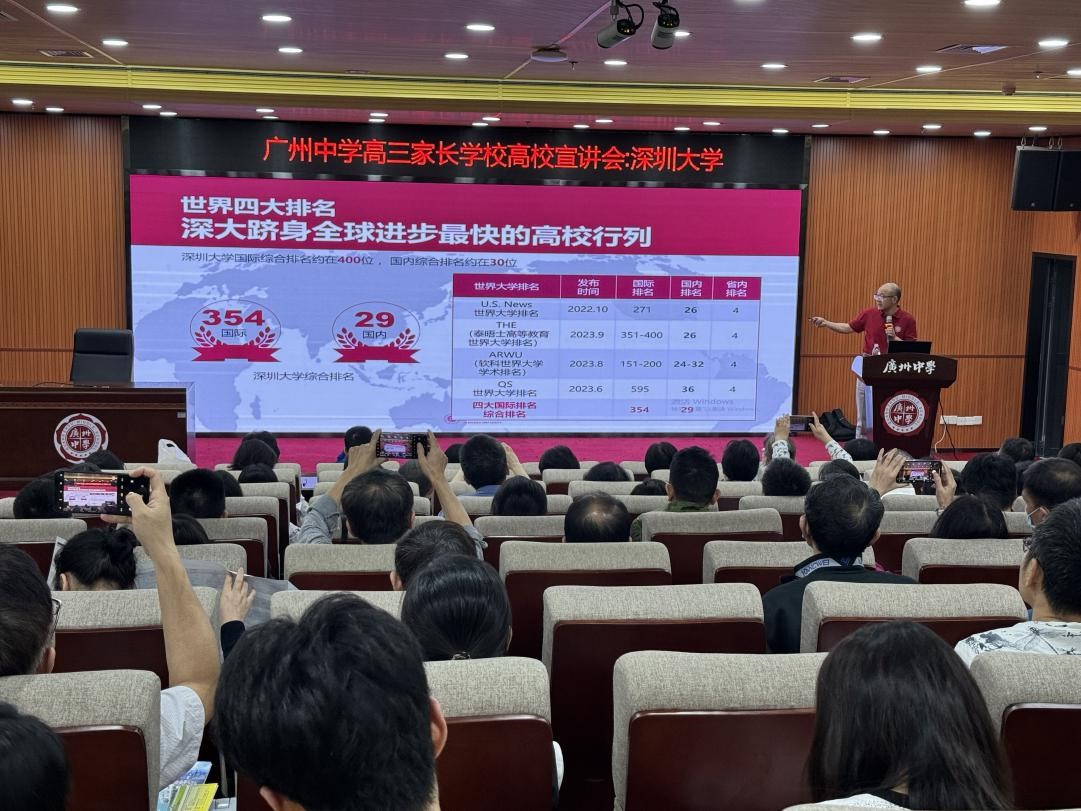 正式宣讲前,老师和志愿者们做了充分的准备,不仅将招生宣传的海报立在讲堂门前,吸引家长们驻足围观,还在现场派发深大的招生宣传手册及文创产品,给广中的家长和同学们留下了深刻的印象。