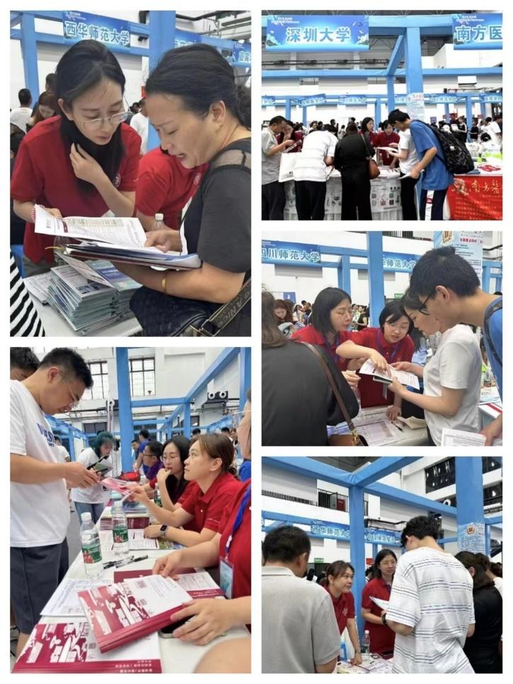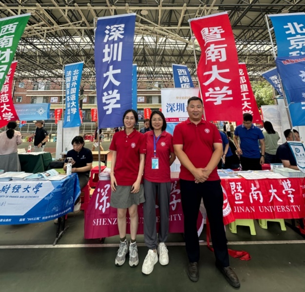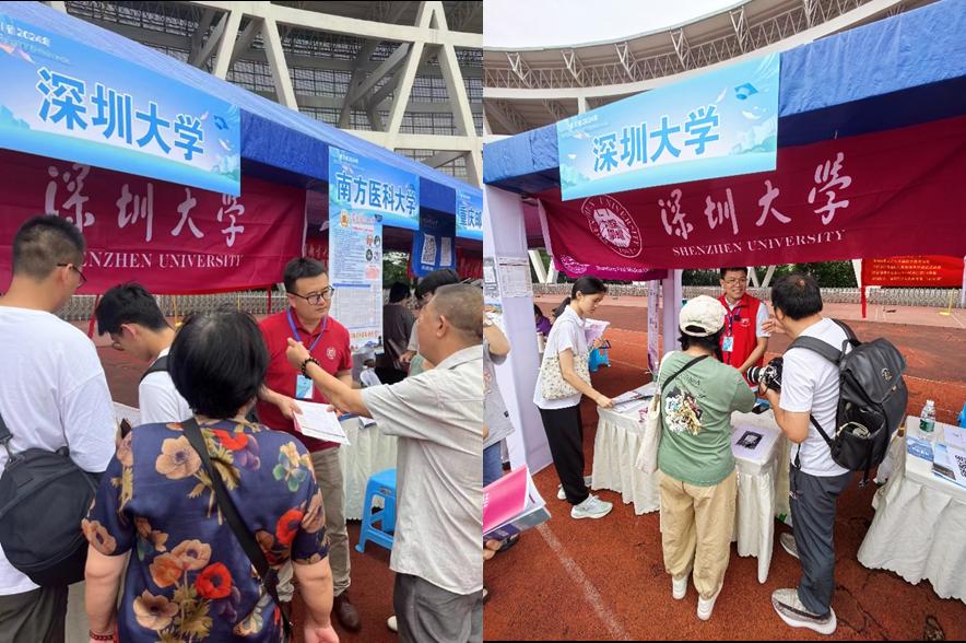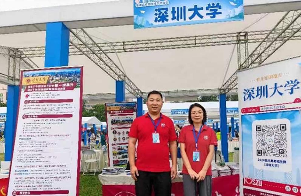 四川高考成绩公布后,老师们迅速行动。6月24日至25日,曹雯老师和岳广辉老师参加了在四川大学华西校区举办的市级招生咨询会。此次活动由四川省招生考试指导中心主办,规模大,时间长。活动第一天从8:30到17:00,第二天从8:30到12:00,期间大量学生和家长前来咨询。深圳大学的摊位人来人往,招生材料大量分发,两位老师向咨询的考生及考生家长详细介绍了深大的往年录取位次,说明了深大的区位优势、就业优势等,鼓励达到位次的考生积极报考。一些考生和家长们对我校的教育质量和培养模式表示高度认可,并表达了浓厚的报考兴趣。