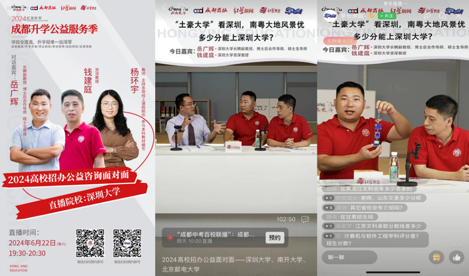 6月22日晚,岳广辉老师、杨环宇老师和钱建庭老师共同参加2024高校招办公益咨询面对面线上直播招生宣讲会,吸引了来自四川省各地的众多学生和家长在线参与,互动热烈。直播过程中,岳广辉和钱建庭老师首先向观众介绍了深圳大学的基本情况、专业设置、招生政策以及培养目标。在连线和评论互动过程中,老师们耐心解答了学生和家长们关于专业选择就业前景等方面的问题,收获了众多感谢弹幕。
