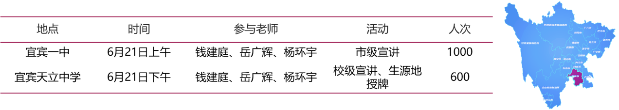 为吸引宜宾考生报考深圳大学,在高考成绩公布前夕,招宣小组于6月21日前往宜宾市第一中学以及宜宾市翠屏区天立学校开展招生宣传工作,具体安排及主要活动内容如下。
