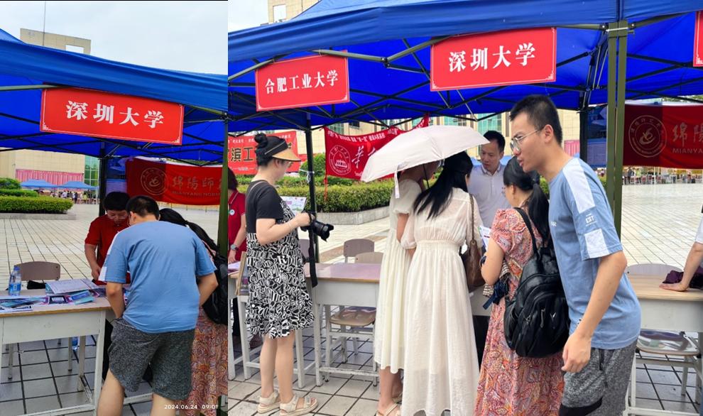 6月25日,多名老师分头行动,参加了数场中学招生咨询会。上午,吴佳英子老师和黄淦老师前往四川绵阳中学,黄炳升老师前往绵阳南山中学。下午,吴佳英子老师、岳广辉老师和曹雯老师参加了绵阳东辰中学高考招生咨询会。虽然校级的招生咨询会人数相较于市级少一些,但是更具有针对性,在这几场咨询会上都有与往年深圳大学在川招生位次接近的考生前来咨询,与老师们交谈甚久,老师们向他们介绍今年的招生政策,推荐感兴趣的专业。