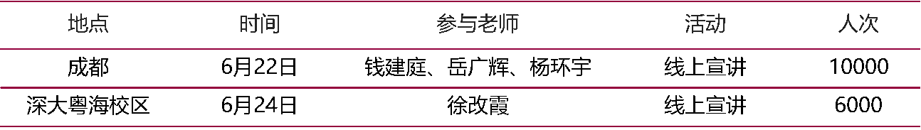 为更好地向成都考生宣传介绍深圳大学,高考之前,招宣小组于4月23日到4月27日前往成都树德中学、成都外国语学校、新津为明中学、泸县二中、隆昌一中、成都天府新区学校开展招生宣讲、名师进中学及生源地授牌等活动;高考结束后,招宣小组于6月10日前往成都理工大学开展市级招生宣讲活动;高考成绩公布后,招宣小组于6月24日至6月25日前往成都理工大学、成都七中万达学校、成都外国语学校、成都七中、四川大学华西校区、成都树德中学等地开展招生宣传工作,具体安排及主要活动内容如下。