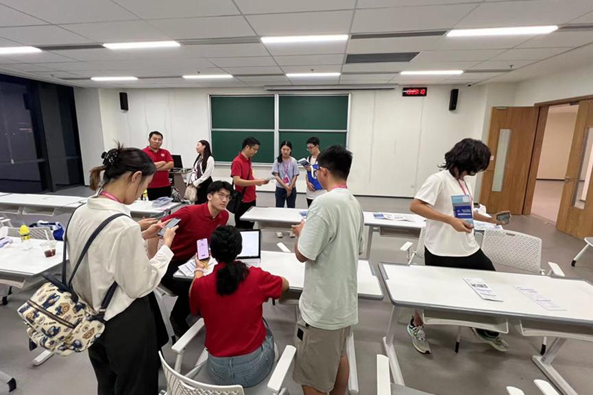 这一举措形成了一张覆盖广泛的宣传网,吸引了众多参赛学生的关注。派发现场不乏学生主动上前索要宣传册并根据自身情况提出具体问题,老师们驻足给出了详尽解答,交流热烈。