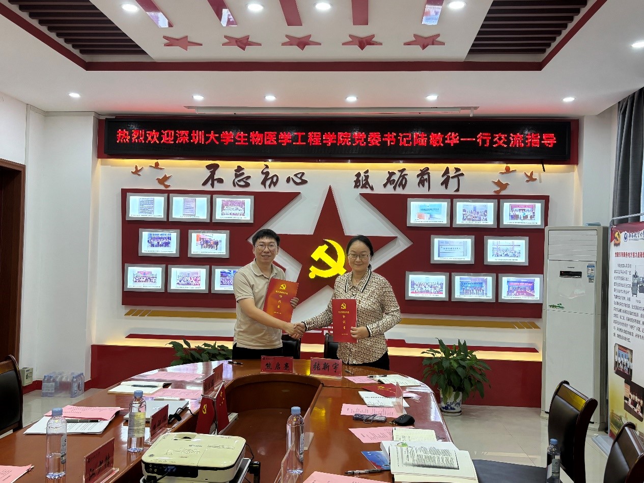 会议最后一项,南昌航空大学生物医学工程系教工党支部与深圳大学生物医学工程学院教工一支部共同签署了“结对共建协议书”,拟在学生培养、教学改革、项目申报等方面充分发挥党员作用,促进两个支部深度合作。
