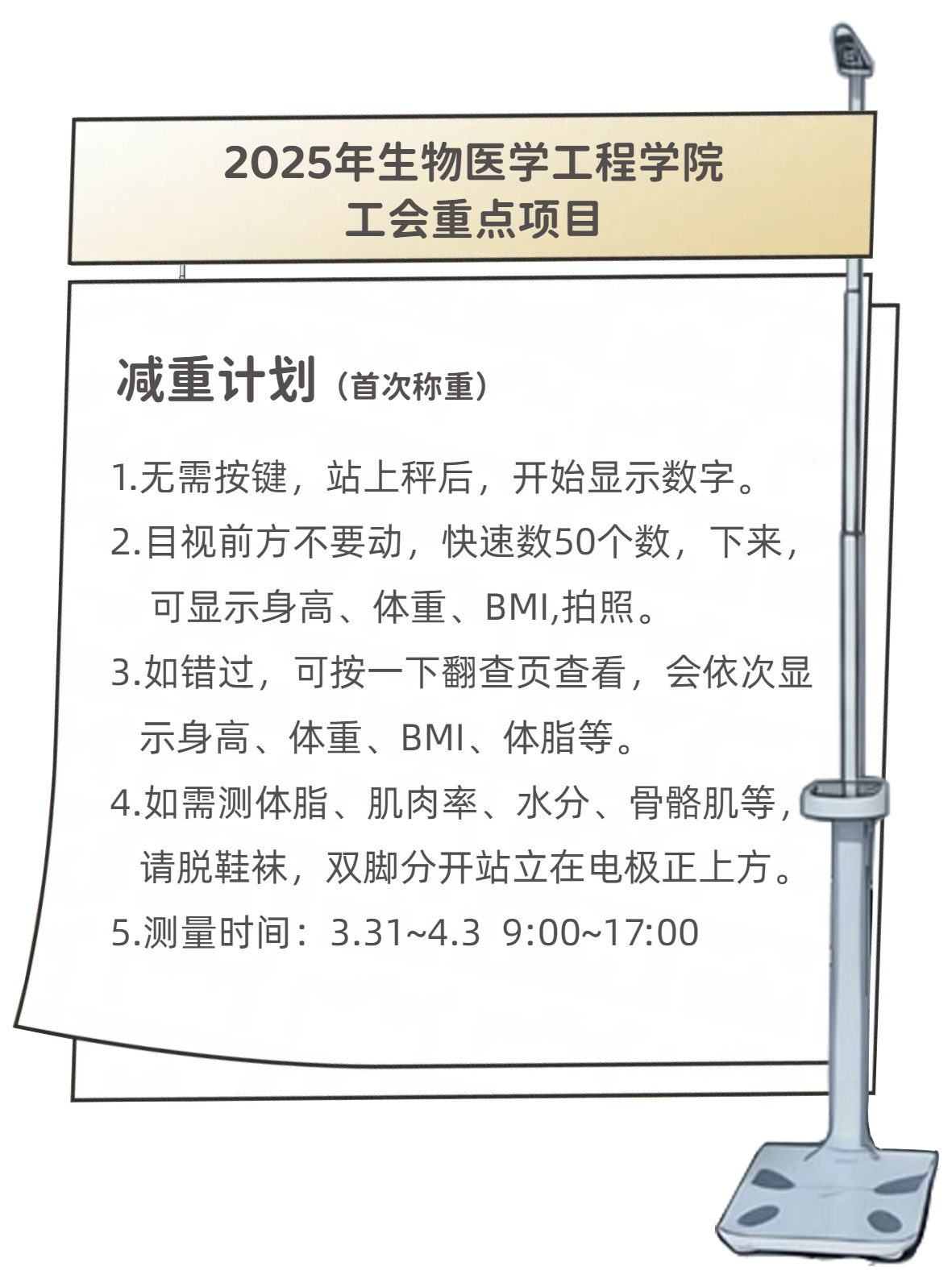 在全国两会将 2024-2026 年设定为“体重管理年”的大背景下,公众对健康体重管理的关注热度攀升至新高度。为响应这一号召,提升学院教职工的健康水平,我院工会正式启动“2025年生物医学工程学院工会重点项目之减重计划”。