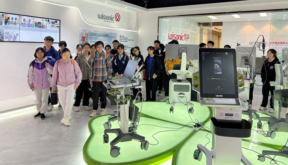 活动伊始,师生们来到公司展厅,了解华声医疗的核心产品及技术成果。展厅展示了最前沿的医疗科技设备,包括超声设备、生命信息支持系统以及华声云平台。金池瑶经理详细介绍了每款产品的功能特点和临床应用场景,让同学们深刻体会到科技如何助力医疗行业发展,为健康事业带来变革。