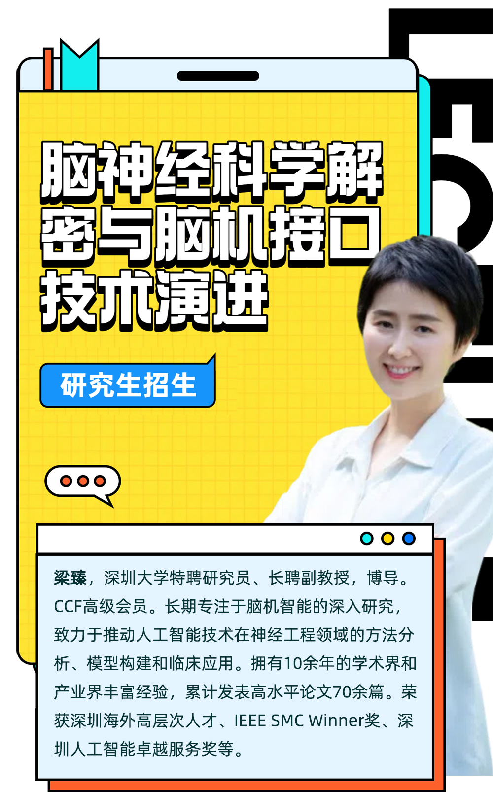 紧接着,梁臻老师详细介绍了深圳大学生物医学工程学院的基本情况,包括学院的学科建设、师资力量、科研平台、重点研究方向与未来发展愿景,并热情邀请有志于科研与创新的同学积极报考深圳大学生物医学工程专业,共同投身于脑科学与人工智能融合发展的时代前沿。