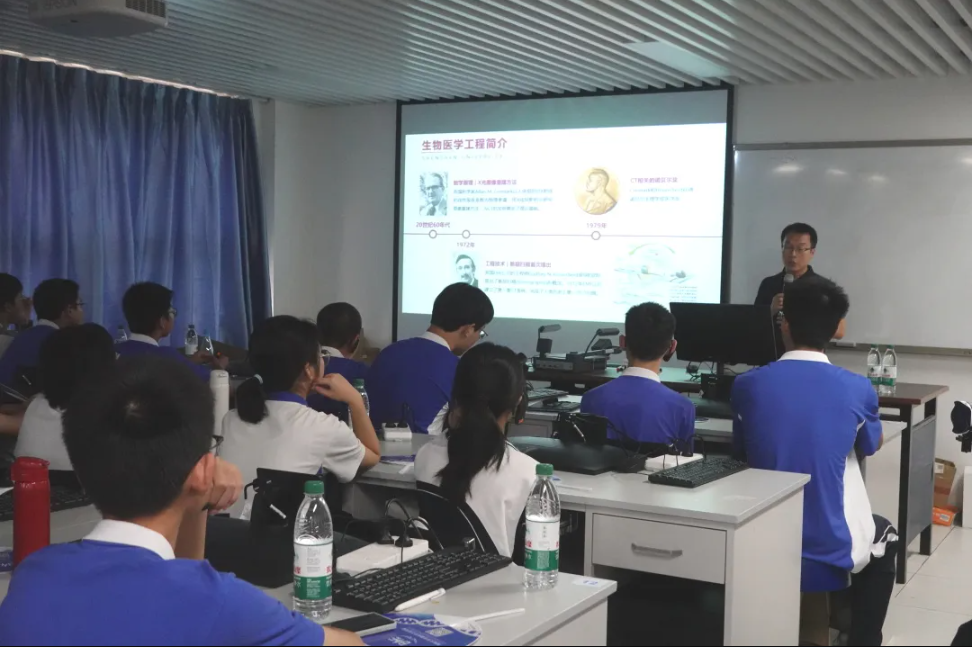 接着,深圳大学医学创新成果转化中心副主任董磊老师为同学们带来一场“生物医学工程大揭秘”的讲座。从该专业在全球范围内的起源、逐步发展壮大,到当下在医疗领域发挥的关键作用,董老师深入浅出地剖析了每一个关键节点。他着重强调了在学习过程中培养创新思维、拓宽眼界的重要性,让同学们在知识的海洋中收获满满的启发。