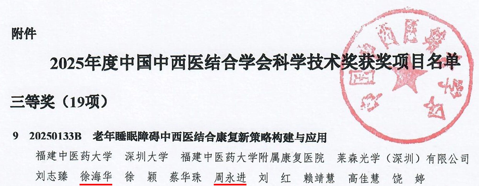 Careers近日,我院徐海华副教授和周永进副教授共同参与申报的两个项目分别荣获2024年度福建省科学技术进步奖二等奖及2025年度中国中西医结合学会(国家一级医学专业学会)科学技术奖三等奖,我校均为第二完成单位。