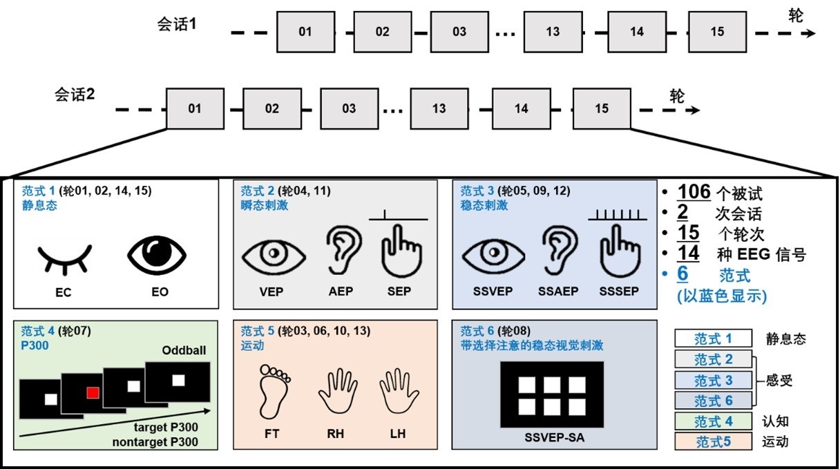 一个可靠的脑纹识别系统应能够抵御个体的精神状态变化(跨范式测试),并且能在数天返回后仍能成功识别个体(跨时段测试)。这里我们建立了一个包含106名被试、不同天的两次实验、多种范式的脑电数据库。其中95名被试参加了两次实验,间隔超过一周。实验包含静息态、任务态、脑机接口等6种脑电常见范式。据我们所知,以前的研究没有在超过100个被试的测试规模下评估脑纹识别算法在跨范式和跨时段场景下的测试性能。