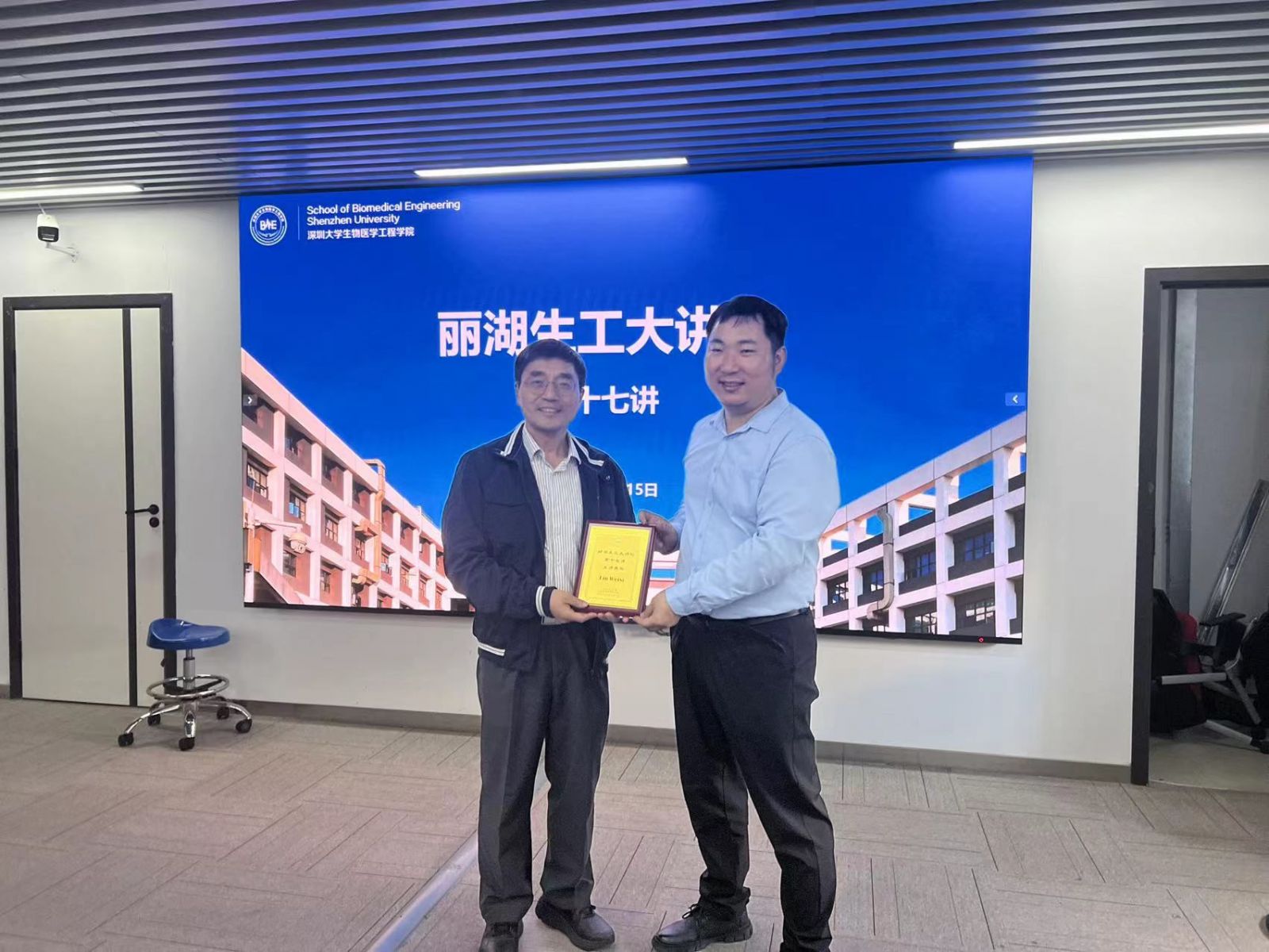 岳广辉副教授向主讲嘉宾Weisi Lin教授颁发生物医学工程学院“丽湖生工大讲坛”荣誉证书
