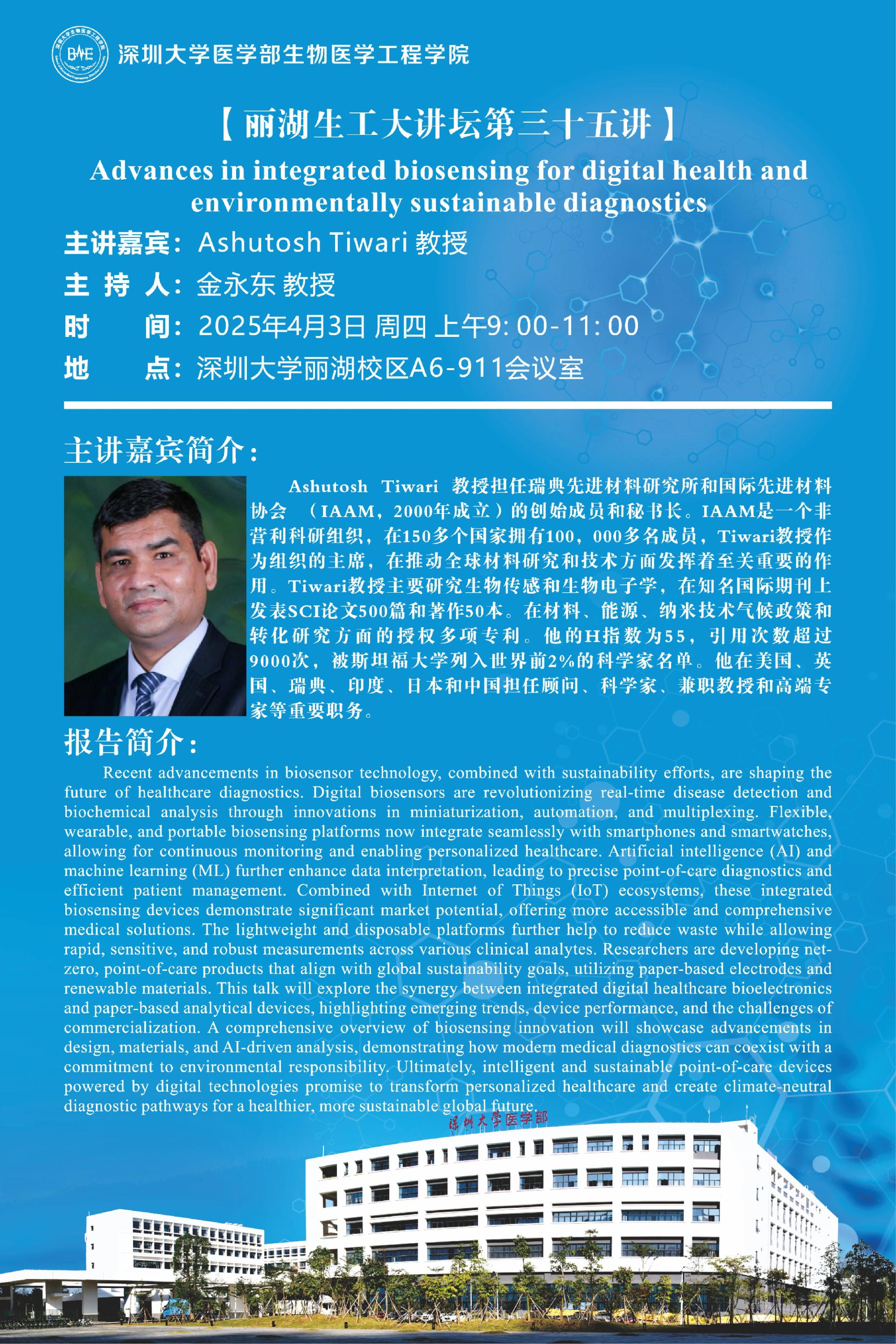 Ashutosh Tiwari 教授担任瑞典先进材料研究所和国际先进材料协会 (IAAM,2000年成立)的创始成员和秘书长。IAAM是一个非营利科研组织,在150多个国家拥有100,000多名成员,Tiwari教授作为组织的主席,在推动全球材料研究和技术方面发挥着至关重要的作用。Tiwari教授主要研究生物传感和生物电子学,在知名国际期刊上发表SCI论文500篇和著作50本。在材料、能源、纳米技术气候政策和转化研究方面的授权多项专利。他的H指数为55,引用次数超过9000次,被斯坦福大学列入世界前2%的科学家名单。他在美国、英国、瑞典、印度、日本和中国担任顾问、科学家、兼职教授和高端专家等重要职务。