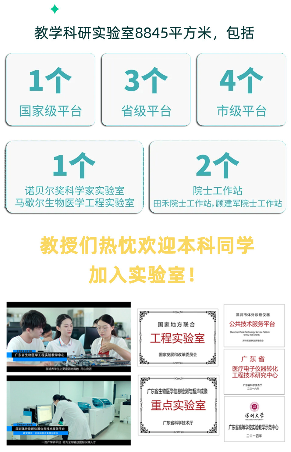 深大生物医学工程学院现隶属医学部,经过近20年的建设发展,建立了本科、硕士、博士和博士后的完整人才培养体系。学院建设有1个国家级科研平台(医学超声关键技术国家地方联合工程实验室)、3个省级平台、4个市级平台、1个诺贝尔奖科学家实验室、2个院士工作站;现有教研实验室面积8000余平米,设备总价值近2亿元。近5年主持国家级项目82项(重大重点类6项,包括国自然重点项目、重大仪器项目等),累计科研经费超过1.6亿元;培养及引进国家级人才1人、青年人才4人;发表中科院1区论文超300篇,包括子刊论文24篇;授权专利超200项。