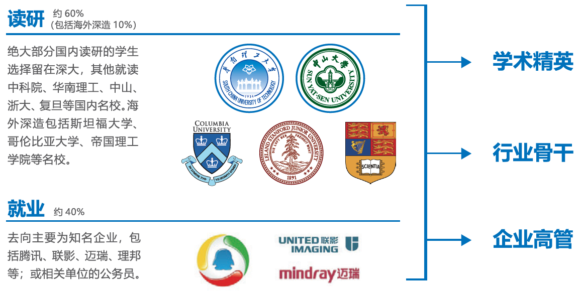 毕业学生有去斯坦福、港大、港中文等名校继续深造学习的,也有进入迈瑞、腾讯、百度、商汤、联影、西门子、飞利浦、东芝等国内外知名上市公司担任要职。