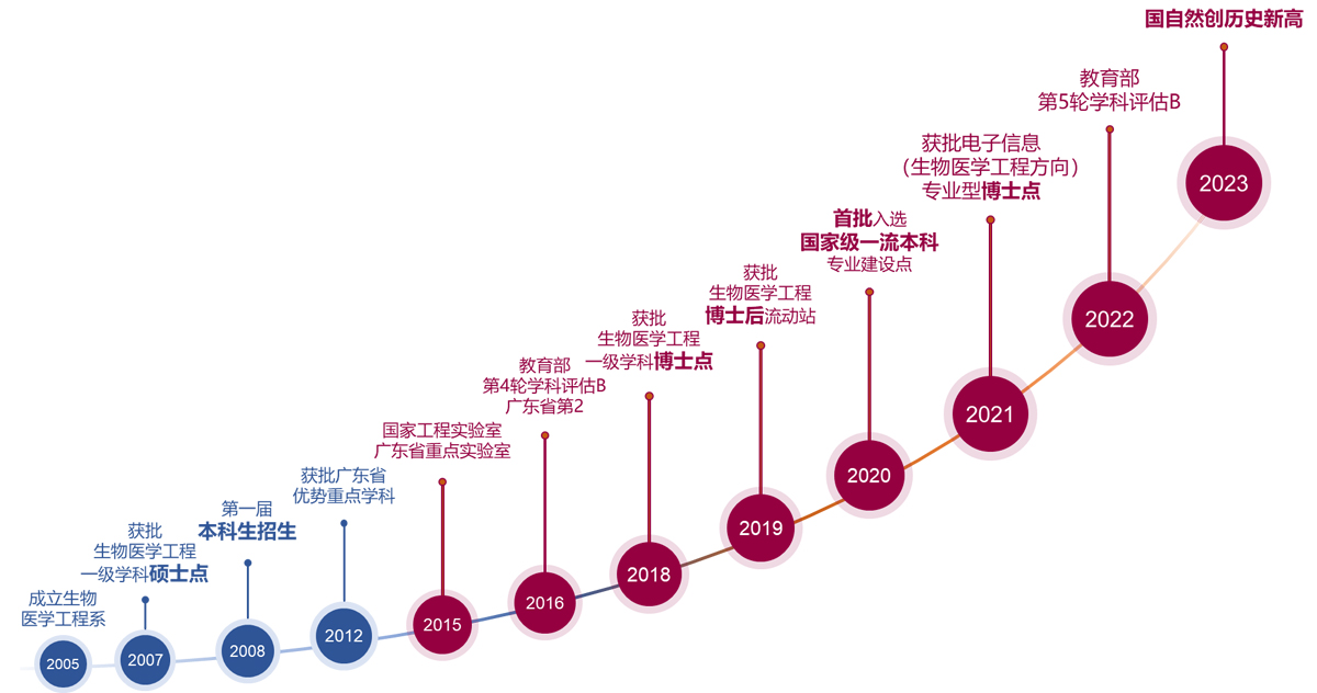 粤港澳大湾区是我国医疗器械产业的重要聚集地,生物医学工程专业在本区域有显著的地域优势。深圳大学生物医学工程学科始建于2005年,2009年整体转入医学院,2012年获批广东省优势重点学科,2015年成立生物医学工程学院,2018年获批生物医学工程一级学科博士点,2019年获批生物医学工程博士后流动站,2020年首批入选国家级一流本科专业建设点,获批教育部新工科专业,2021年获批专业博士点(生物医学工程领域方向),2022年深大教务部本科专业评估排名全校第一,教育部学科评估B级,广东省第二。