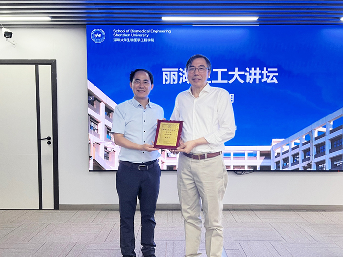 黄鹏教授向主讲嘉宾卿凤翎研究员颁发生物医学工程学院“丽湖生工大讲坛”荣誉证书。