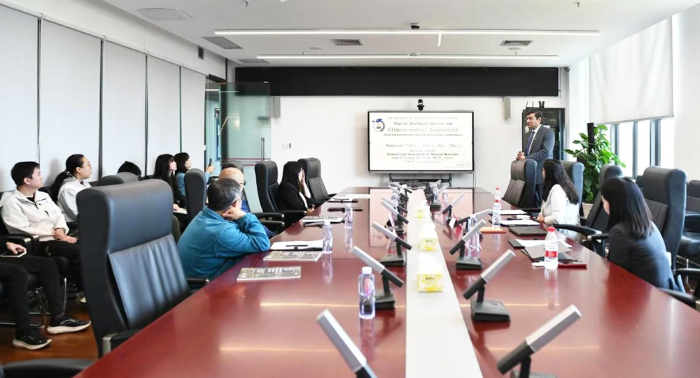 Ashutosh Tiwari教授围绕“集成生物传感在数字健康领域进展”主题,和师生们探讨了智能诊断、生物传感器和材料科学在实现实时疾病管理和优化个人健康方面的重要应用。他详细阐释了智能传感器、柔性电子设备如何通过实时数据采集优化疾病管理,并结合人工智能技术实现个性化健康干预。他还展示了数字技术如何赋能远程健康管理,比如通过AI驱动的移动互联网平台,实现老年人与残疾人群体的实时健康监测,以降低急诊需求。此外,他将其与环境可持续发展相结合,分析了医疗行业在减少碳排放、推广生态化医疗设备及自然疗法中的实践案例,比如通过靶向疗法和数字监测减少过度医疗、推动医疗设备回收、再生材料应用和利用植物活性成分降低药物生产成本及环境负担等。