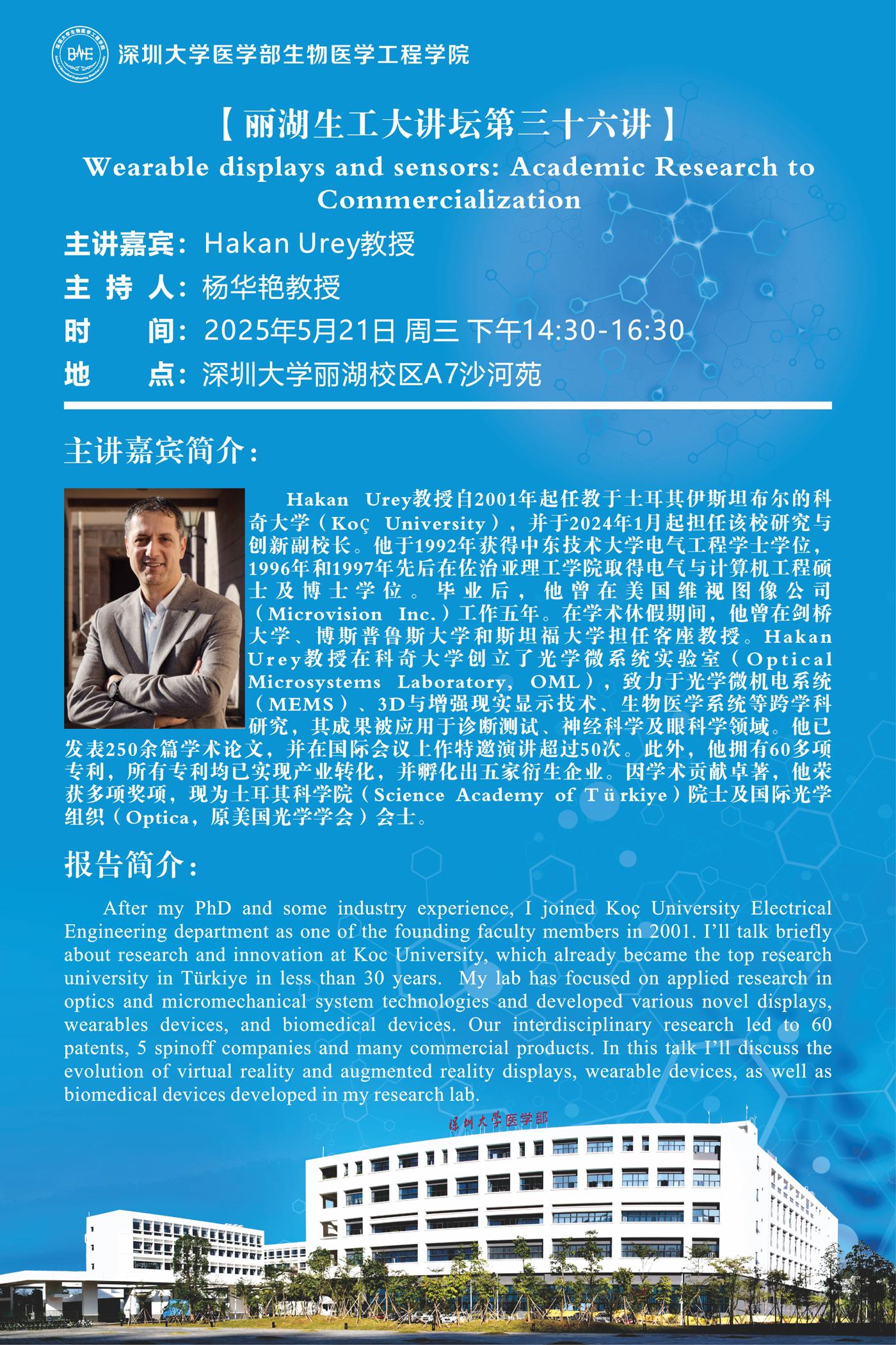 Hakan Urey教授自2001年起任教于土耳其伊斯坦布尔的科奇大学(Koç University),并于2024年1月起担任该校研究与创新副校长。他于1992年获得中东技术大学电气工程学士学位,1996年和1997年先后在佐治亚理工学院取得电气与计算机工程硕士及博士学位。毕业后,他曾在美国维视图像公司(Microvision Inc.)工作五年。在学术休假期间,他曾在剑桥大学、博斯普鲁斯大学和斯坦福大学担任客座教授。
