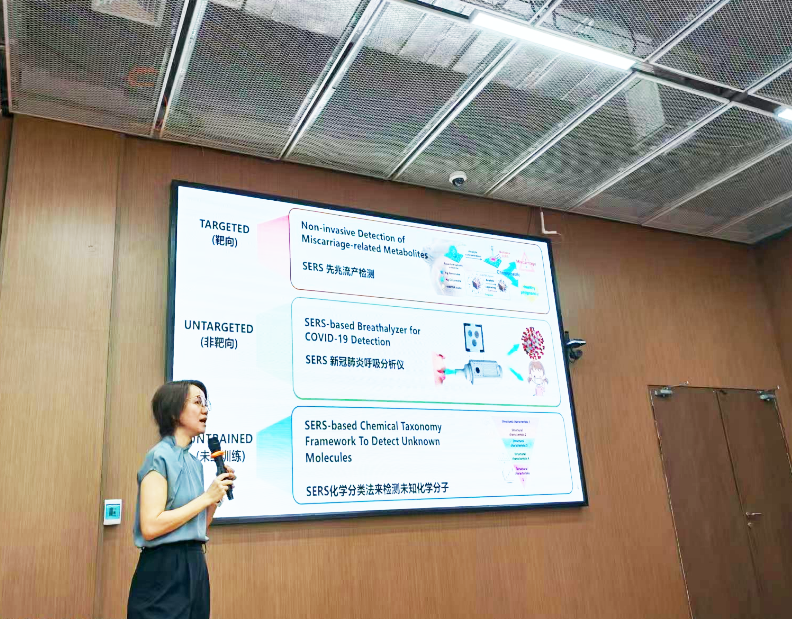 林歆怡教授在报告中图文并茂地展示了纳米材料结合表面增强拉曼光谱技术在分子检测方面的最新进展,同时介绍了机器学习和机器人技术在科研中的应用,对比传统人工作业,使用机器人技术参与参数调控能够实现对合成材料的尺寸、形状与纯度的精准调控和定向设计,大幅提升合成效率和质量;使用机器学习能够显著提升标志物的检测效率和准确性,并且存在预测未知疾病分子的可能。