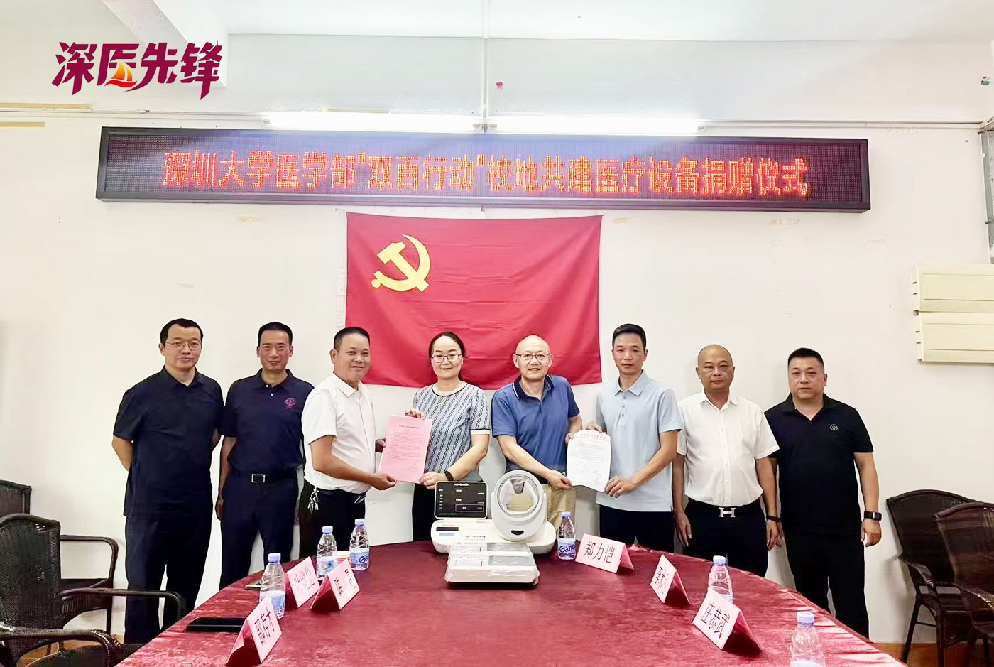 深圳大学医学部党委副书记王嘉蔚,教工第一党支部书记张新宇、叶继伦教授,研究生第一党支部书记陈冕等组成专项团队,与陆丰市博美镇党委书记张伟明、陆丰市卫生健康局党组成员庄恭武、深圳大学“双百行动”驻陆丰邵存才主任及博美镇、甲西镇卫生院负责人共同参与活动。捐赠仪式上,深圳大学医学部代表向博美镇和甲西镇两家卫生院移交了捐赠的设备,收到了两家医院的感谢信。
