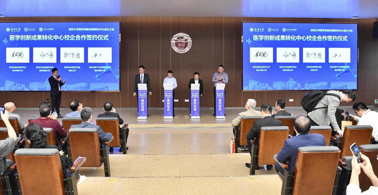 医学创新成果转化中心校企合作签约仪式和转化中心项目合作签约仪式接踵而至,标志着学术研究和产业合作的深度融合。在这个过程中,各方代表共同见证了医学创新成果向市场转化的具体契机。参与签约的首批企业有:深圳迈瑞生物医疗电子股份有限公司、深圳开立生物医疗科技股份有限公司、深圳市科曼医疗设备有限公司、深圳市新产业生物医学工程股份有限公司、深圳市亚辉龙生物科技股份有限公司、深圳普门科技股份有限公司、爱永星辰(广州)医药科技有限公司、深圳中科新进生物科技有限公司。