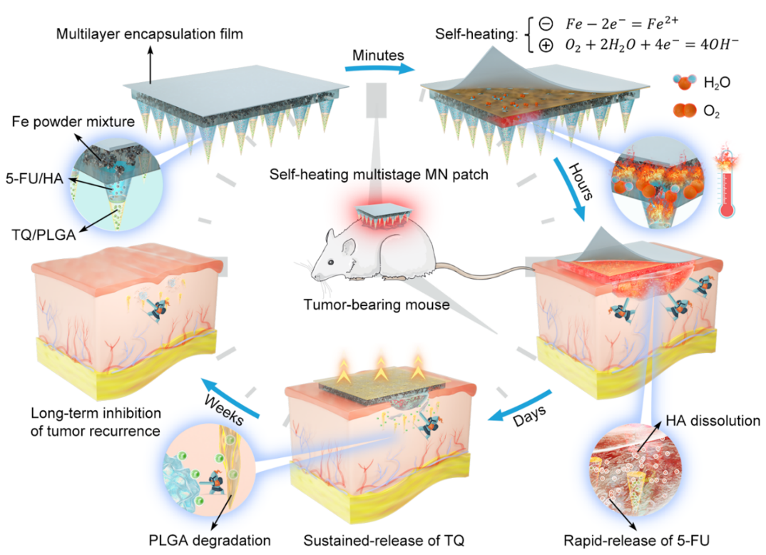 其中,微针基底由生物医用高分子透明质酸(HA)组成,治疗时可快速溶解,释放抗肿瘤药物5-氟尿嘧啶(5-FU)进行高效的皮肤癌治疗。针尖则由具有适当生物可降解性能的聚乳酸-羟基乙酸共聚物(PLGA)组成,治疗时随着基底的溶解,针尖脱落并长期滞留在病灶部位,可实现抑瘤药物百里醌(TQ)的缓释,长效抑制皮肤癌复发。背衬层内则填充了自发热材料,基于微米级铁粉的氧化放热反应,使得微针给药系统具有高效的自发热性能。我们通过系统的体外和体内实验,验证了其优异的程序化药物释放性能,良好的皮肤癌治疗效果,且可以长效抑制肿瘤复发。自发热效应不仅实现了一定的皮肤癌热治疗效果,更重要的是,它表现出非常好的热促进药物释放效果,在药物递送速率、渗透深度、给药量等方面都有很大的提升。这种具有多级结构的自发热微针载药贴片具有巨大的临床应用前景,特别是在皮肤癌治疗方面。