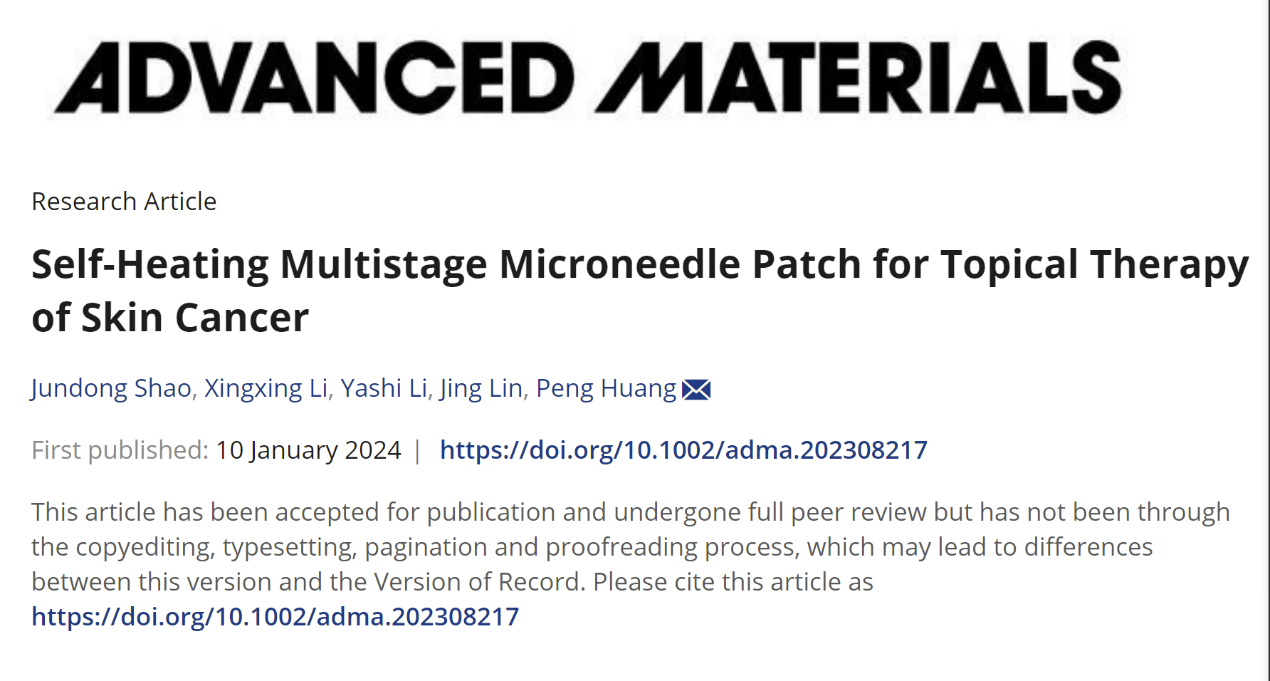 Careers近日,深圳大学医学部生物医学工程学院黄鹏特聘教授团队在国际顶级学术期刊Advanced Materials(影响因子29.4,中科院一区,TOP期刊)上发表了题为“Self-Heating Multistage Microneedle Patch for Topical Therapy of Skin Cancer”的研究论文。这篇论文的所有工作均在深圳大学完成,该团队邵俊东副研究员(现为广州医科大学教授)和研究生李星星为论文共同第一作者,黄鹏教授为独立通讯作者,该团队所在的生物医学工程学科属于广东省优势重点学科。
