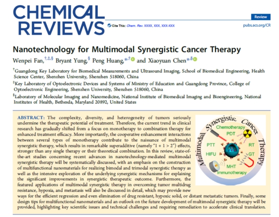 Careers 近日,深圳大学医学部生物医学工程学院黄鹏特聘教授团队在美国化学会创办的化学类国际顶级学术期刊Chemical Reviews(影响因子47.928,中科院JCR 1区,TOP期刊)上发表了题为《Nanotechnology for Multimodal Synergistic Cancer Therapy》的综述性学术论文(DOI:10.1021/acs.chemrev.7b00258)。深圳大学是第一单位和第一通信单位,该团队范文培博士是第一作者,黄鹏教授和陈小元教授为通讯作者,该团队所在的生物医学工程学科属于广东省优势重点学科。