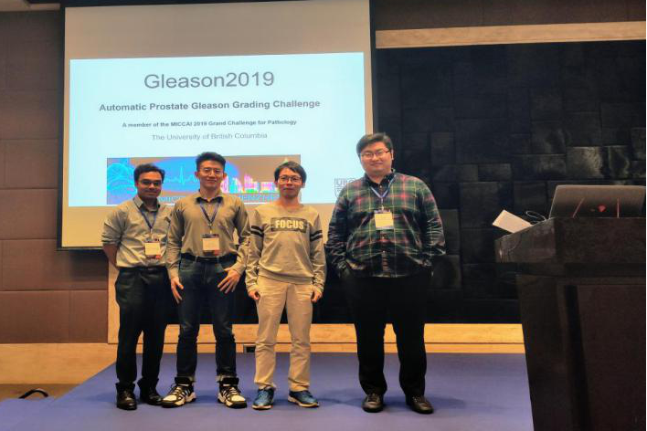另外,前列腺癌数字病理切面的自动格里森分级竞赛(Automatic Gleason grading of prostate cancer in digital histopathology challenge 2019,竞赛主页: http://gleason2019.grand-challenge.org/Home/)由加拿大知名大学不列颠哥伦比亚大学组织。前列腺癌是全球男性第六常见和第二致死的癌症,病理学医生通过在显微镜下观察穿刺活检的切片,可以准确进行前列腺癌的分级。根据病理切片上观察到的腺体特征,按照Gleason评分系统进行分级。该竞赛吸引了100多支队伍参加,汪天富教授和雷柏英副教授指导的研究生胡玉进、孔沛瑶、张永涛和郭力宝等同学组成的队伍,在竞赛中取得了全部两项任务的第一名。