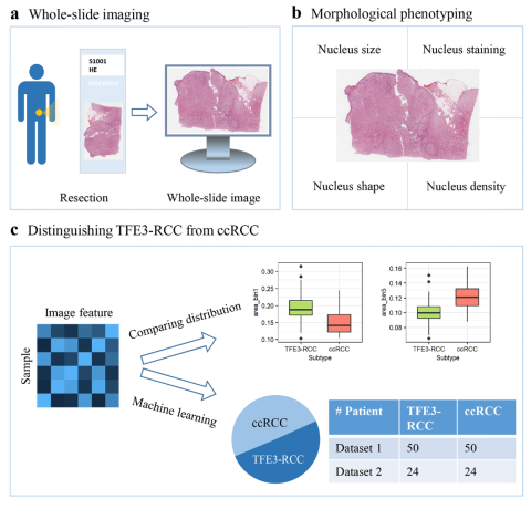 TFE3 Xp11.2 translocation renal cell carcinoma(TFE3-RCC)是一种罕见的肾细胞癌,相较于其他肾细胞癌亚型,其恶性程度更高,但临床诊断过程中病理医生很难通过常规的H&E染色病理切片将TFE3-RCC与其他肾细胞癌亚型区分,而是需要借助其他操作更为复杂的方法如荧光原位杂交进行鉴别诊断。该研究基于常规的H&E染色病理切片,收集了迄今为止样本量最大的TFE3-RCC数据集,设计开发了一种利用计算机自动分析数字病理图像的分析方法(图1),寻找对TFE3-RCC和透明细胞肾细胞癌(最常见的肾细胞癌,约占75%)具有显著鉴别能力的细胞形态学特征,并利用机器学习的方法对这两种类型的癌症进行自动区分。在独立的验证集上,该研究所提出方法的分类性能可达ROC曲线下面积0.894。