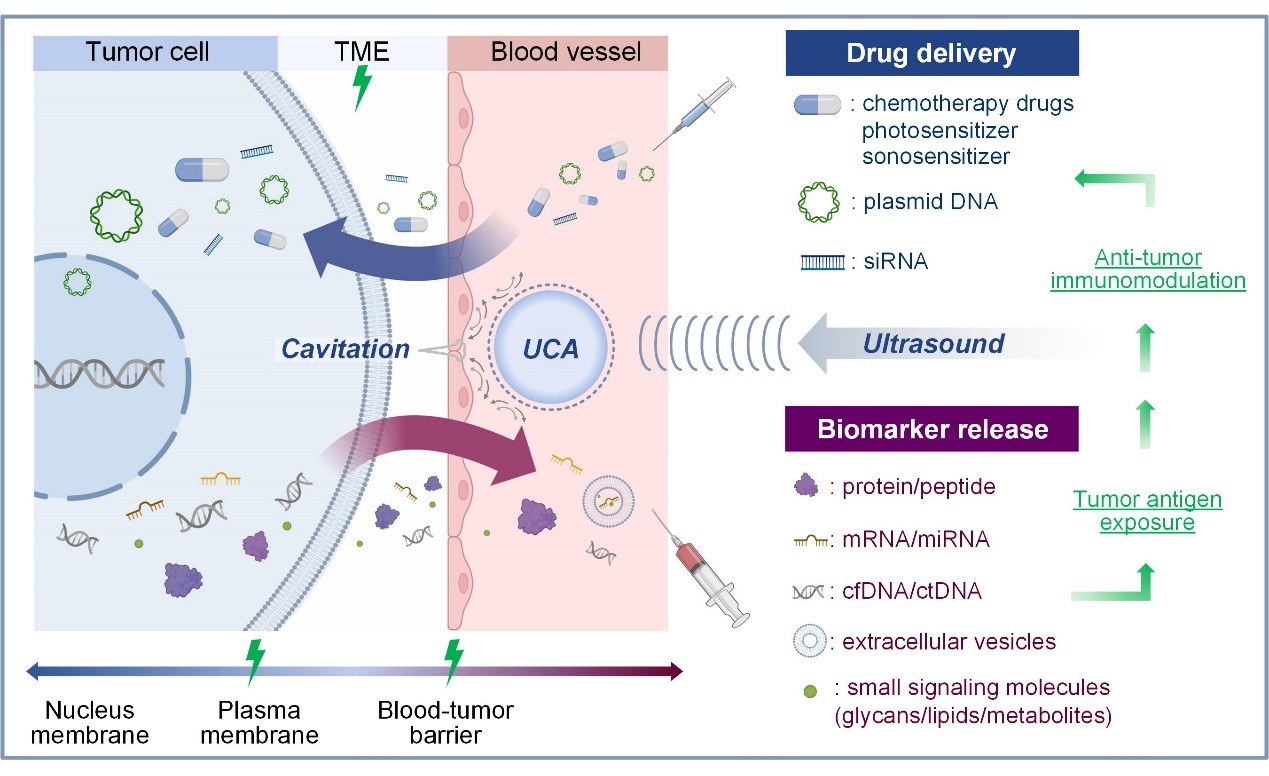 体外施加的超声能量可以无创聚焦于体内肿瘤区域。超声联合微纳声敏剂可以通过空化效应打开肿瘤内多级生物屏障(细胞膜、血管壁和肿瘤微环境),从而创造出向肿瘤内递送药物和向肿瘤外释放标志物的重要双向通道。团队在声学领域排名第一的期刊Ultrasonics Sonochemistry(中科院大类一区,TOP期刊,IF: 9.336)发表了题为“Barrier-breaking effects of ultrasonic cavitation for drug delivery and biomarker release”的综述论文。