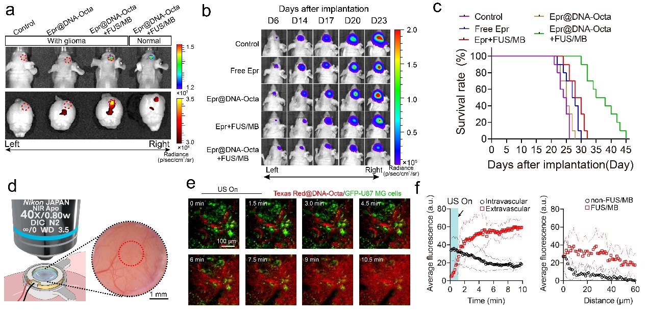 在此项研究中,团队构建了具有pH响应特性的DNA正八面体纳米结构作为药物载体,搭载抗癌药物表阿霉素。超声联合微泡递送可显著增强递送至脑胶质瘤的DNA纳米笼,并能够在脑胶质瘤酸性环境中释放药物。经过该方法治疗的颅内原位恶性脑胶质瘤裸鼠模型中位生存时间比对照组增加了49%。该研究的亮点是采用双光子荧光活体成像技术,在活体动物身上观察到了超声向脑胶质瘤递送大分子药物的动态实时过程。