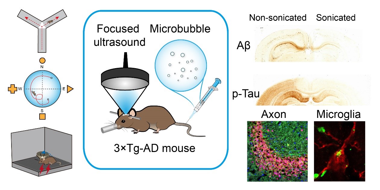 在该研究中,对能同时表现出AD两大病理特征(β-淀粉样蛋白沉积和Tau蛋白病变)的3×Tg-AD小鼠进行了每周两次、为期六周的低强度超声联合微泡开放其血脑屏障的治疗。行为学测试结果表明经过低强度超声联合微泡治疗的3×Tg-AD小鼠的记忆学习能力与对照组相比得到了显著性的提高。大脑皮层区、海马区和杏仁核区的Aβ沉积和病变Tau蛋白水平显著降低。进一步的研究结果发现治疗后的3×Tg-AD小鼠小胶质细胞被激活并吞噬脑内的Aβ沉积。论文的第一作者为沈圆圆副教授,通讯作者为陈昕教授和杨细飞教授;深圳大学为第一完成单位。