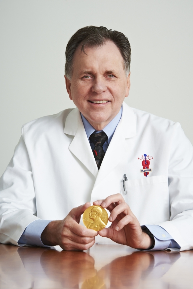 巴里•马歇尔(Barry Marshall) 教授1951年出生于西澳大利亚,1974年获西澳大利亚大学硕士学位; 1986年成为珀斯皇家医院肠胃病学研究员;1994年成为美国弗吉尼亚大学研究员和临床教授;1996年成为弗吉尼亚大学内科学科研教授;1997年重返澳大利亚成为西澳大利亚大学临床教授;1999年开始担任西澳大利亚大学临床微生物学教授;2003年出任西澳大利亚大学NHMRC幽门螺杆菌实验室首席研究员;2005年获得诺贝尔生理或医学奖;2008年当选中国科学院外籍院士;2011年当选中国工程院外籍院士。1982年,巴里•马歇尔教授与罗宾•沃伦医生发现了寄居在人胃部的螺旋状细菌,并在后续的实验中证明了该细菌与胃肠道疾病的密切联系,从而开辟了胃肠道疾病研究的新时代,2005年他们也因此获得了诺贝尔生理或医学奖。马歇尔教授早在获得诺贝尔奖之前,就已经在胃肠道疾病研究领域有了20多年的研究和产品开发经验,开发出了幽门螺旋杆菌诊断的相关产品,并申请专利和成立了相应的公司。
