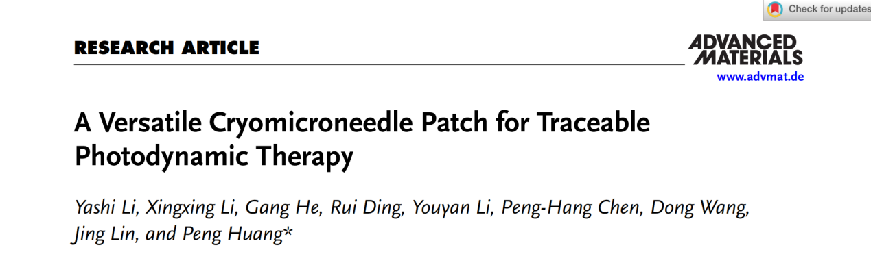 Careers近日,深圳大学医学部生物医学工程学院黄鹏特聘教授团队在国际顶级学术期刊Advanced Materials(影响因子29.4,中科院一区,TOP期刊)上发表了题为“A Versatile Cryomicroneedle Patch for Traceable Photodynamic Therapy”的研究论文。这项研究的所有工作均在深圳大学完成,该团队研究助理李雅诗、研究生李星星和博士后贺港为论文共同第一作者,黄鹏教授为独立通讯作者,深圳大学为唯一通讯单位,该团队所在的生物医学工程学科属于广东省优势重点学科。