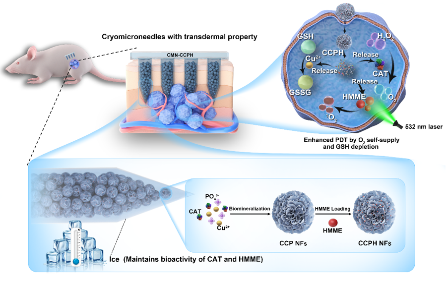 微针给药技术在无痛和精准给药方面展现出巨大潜力,尤其在皮肤癌的治疗中具有独特的优势。目前可用的溶解微针主要是在室温下制造和保存的,因此不利于不稳定PS的递送。近日,该研究团队开发了一种多功能冰微针药物递送系统(简称:CMN-CCPH),首先制备了负载有光敏剂血卟啉单甲基醚(HMME)的磷酸铜矿化过氧化氢酶(CAT)纳米花(CCPH),然后装载在特殊工艺制备的冰微针贴片中,CMN-CCPH可高效地维持HMME和CAT的生物活性,显著地提高了HMME的生物利用度和PDT的疗效。同时,利用荧光(FL)/光声(PA)成像进行实时监测,不仅有助于可视化肿瘤内HMME的富集,还可以评估血红蛋白氧饱和度(sO2)。通过可视化的FL/PA双模态成像,优化了异质性恶性肿瘤的PDT治疗参数,大大地增加了PDT治疗参数选择的灵活性,并为PDT潜在适应症的伴随诊疗提供了理论支撑。