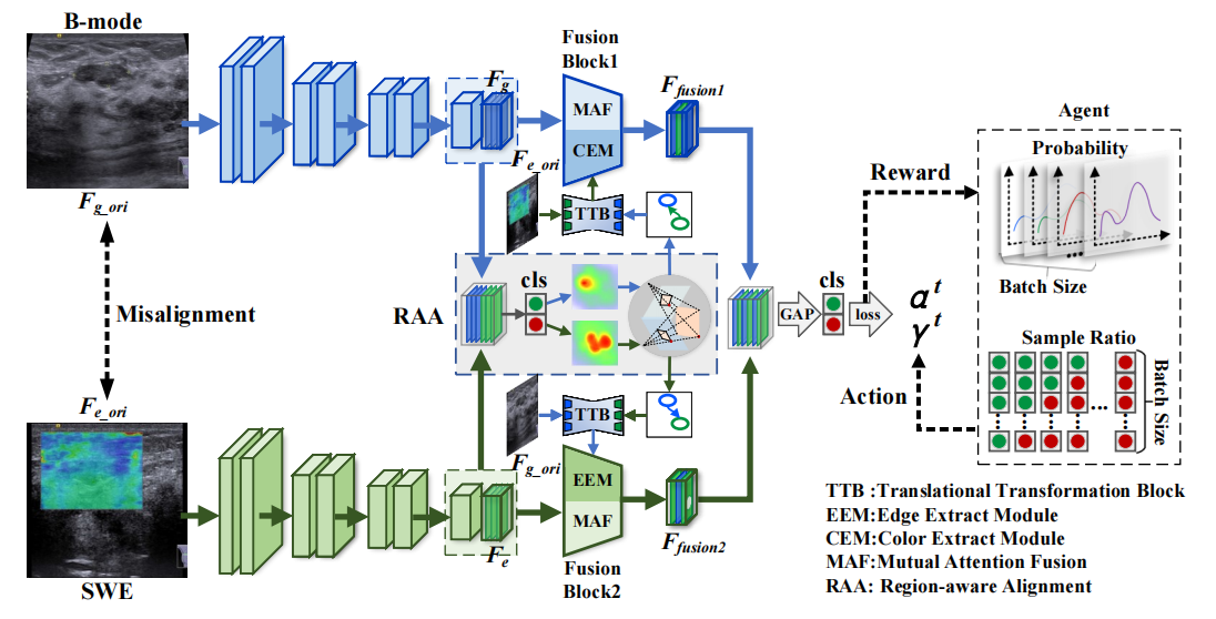 多模式超声图像中乳腺癌的自动准确分类对于提高患者的诊疗效果、节约医疗资源至关重要。在深入研究中,多模态超声图像的融合经常遇到诸如错位、互补信息利用有限、特征融合的可解释性差以及样本类别不平衡等挑战。为了解决上述问题,团队引入了一种特征对齐相互关注融合方法(FAMF-Net),有效地融合了未对准的多模态乳腺超声图像,并促进了不平衡数据上的乳腺肿瘤分类。该方法通过平移变换在类激活图(CAM)上应用区域感知对齐(RAA),解决图像错位问题,实现了更好的特征交互融合。其次,引入了种互注意力融合(MAF)机制,以交互方式融合B模式特征和剪切波弹性图像特征,针对两种模态的边缘和颜色特征进行针对性优化,从而实现了两种模态特征的可解释和有效融合。最后,设计了一种基于强化学习的动态优化策略(RDO)来调整损失函数的权重,减轻数据不平衡对分类性能的不利影响。该方法的有效性在团队基于临床获得的数据集和公开数据集均得到了验证。