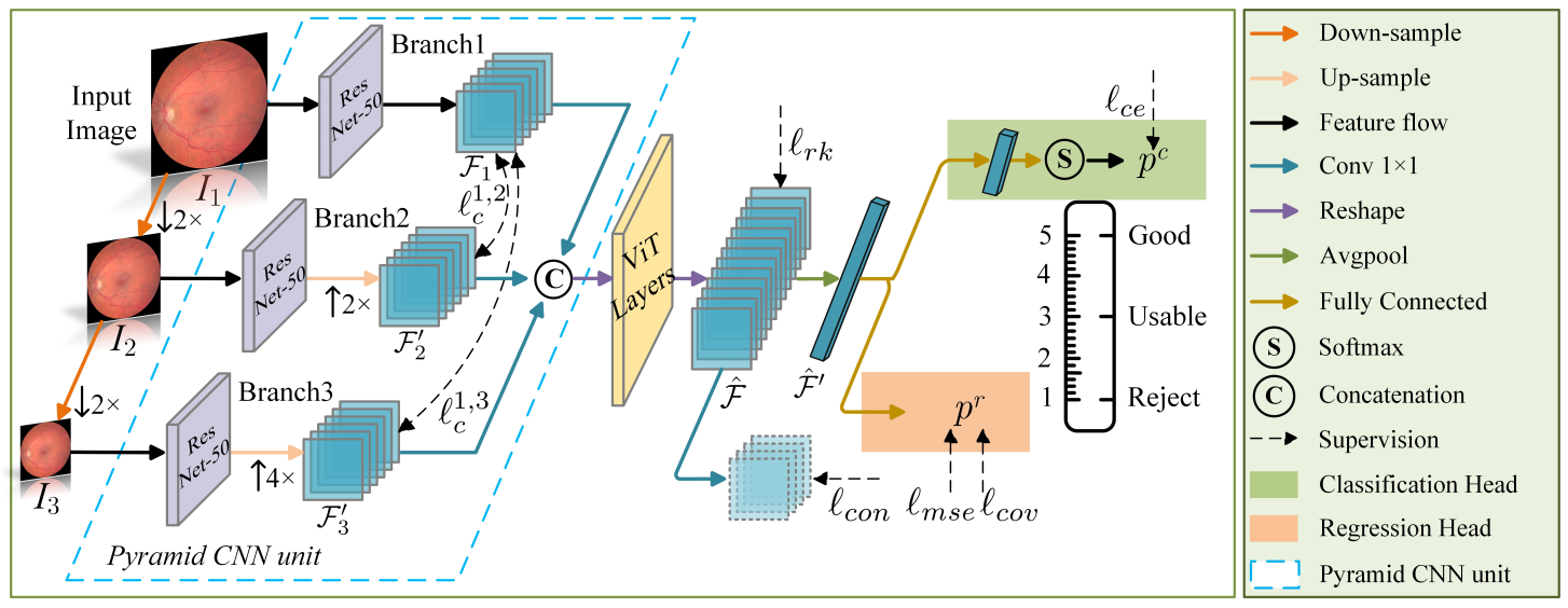 视网膜照相因其无创性、低成本和信息丰富而广泛应用于视网膜疾病的筛查和诊断。然而,在成像过程中由于内部和外部因素通常会导致视网膜图像质量的衰退,例如不均匀光照和低对比度等失真。低质量的视网膜图像无法为临床的精确诊断提供保障,增加漏诊和误诊的风险。因此,为了确保诊断的准确性,在使用图像之前对其进行质量评估是很有必要的。